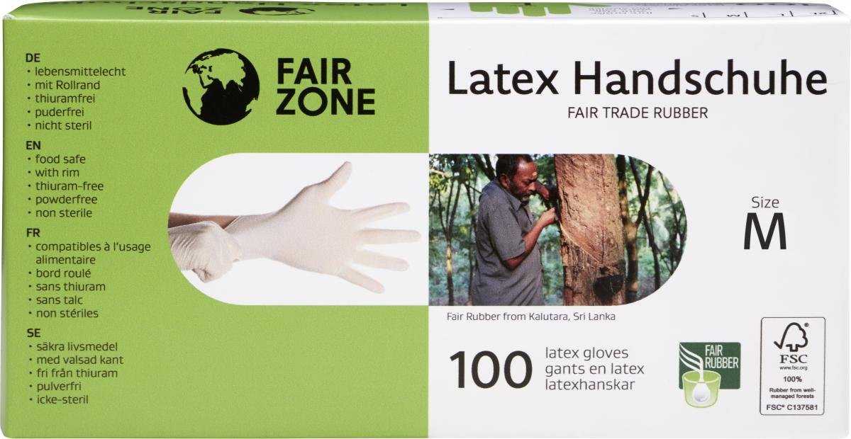 Fair gehandelte und mit FSC® 100 % zertifizierte Einweghandschuhe aus Naturkautschuk. Im Vergleich zu konventionellen Einweghandschuhen wurde für dieses Produkt fair gehandelter Naturkautschuk verwendet. 100 Stück im Dispenser, in den Größen S, M und L erhältlich.