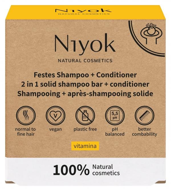 Ein festes Shampoo ohne Abstriche: Das feste 2 in 1 Shampoo von Niyok besitzt dank der speziellen Formulierung eine Conditioner-Funktion, die die Haare besonders weich und kämmbar machen. Es spendet reichlich Feuchtigkeit und schenkt dem Haar natu?rliches Volumen. Mit einem pH-Wert von 5,5 ist es hautneutral und damit besonders sanft zu deiner Kopfhaut.