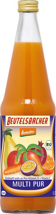 Multi Pur ist aus aromatischen Direktsäften. Die tropischen Früchte werden im Ursprungsland schonend gepresst, um das volle Aroma optimal zu erhalten. Unser Rezept mit Direktsäften aus verschiedenen Kontinenten ergänzt Ihr Ernährungsangebot interessant. Unser Direktsaft enthält nur die fruchteigenen Vitamine und sogar Karottensaft aus samenfestem Saatgut. Übrigens wurde Beutelsbacher Multi Pur schon 1996 von der Jury der Ökologischen Weltausstellung IFOAM in Kopenhagen als bestes deutsches Produkt ausgezeichnet.
