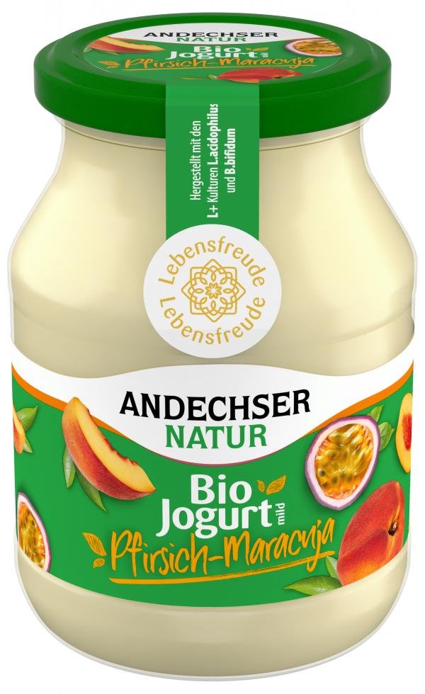 Cremiger Jogurt mild aus frischer, pasteurisierter Bio Milch mit natürlichem Fettgehalt und Pfirsich-Maracuja-Zubereitung. 7% Pfirsiche und 1% Maracujasaft im Endprodukt überwiegend (L+)-rechtsdrehende Milchsäure ohne Aromazusatz glutenfrei.