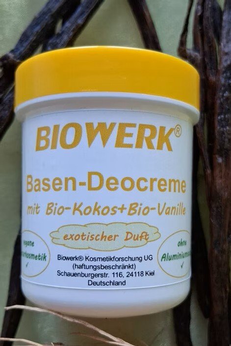 Unsere aluminiumsalzfreie, vegane Basen-Deocreme mit Bio-Kokos+Bio-Vanille bietet einen natürlichen Schutz vor saurem Schweißgeruch und pflegt die Haut gleichzeitig. Wir verzichten in unserer Deocreme auf synthetische Duft,- und Farbstoffe, sowie Konservierungsmittel.