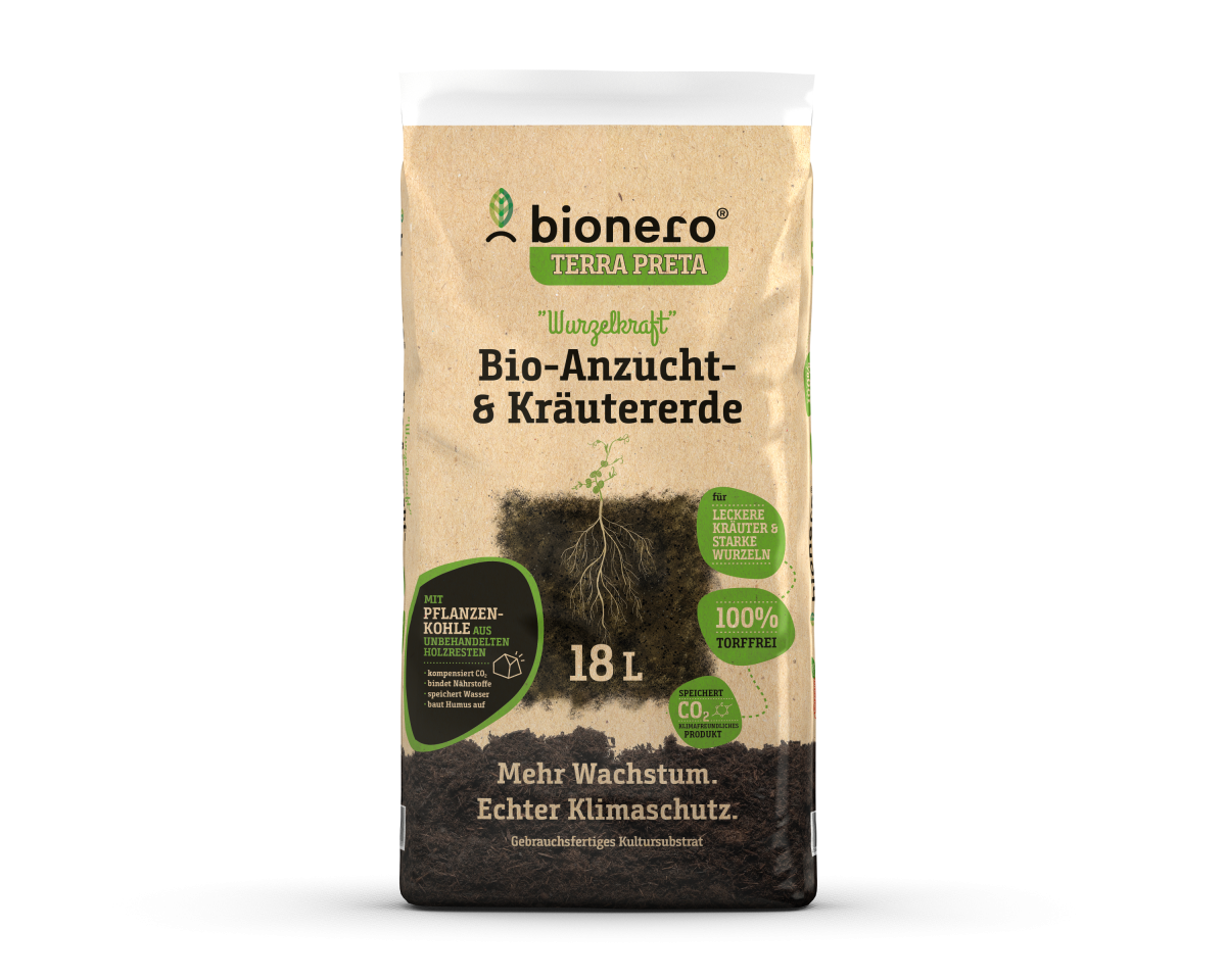 Die Erde entsteht in einem langen Reifeprozess. Die beigesetzte, aktivierte Pflanzenkohle dient im Boden als optimaler Nährstoff- und Wasserspeicher und bietet wichtigen Lebensraum für essenzielle Mikroorganismen. Es wird bewusst auf Torf, Mineraldünger und andere CO2-intensive Rohstoffe verzichtet. Terra Preta ist eine im Amazonasgebiet wiederentdeckte Schwarzerde, die über außergewöhnliche Speicherkapazitäten verfügt und dadurch besonders fruchtbar ist. bionero hat das Herstellungsverfahren dieser fruchtbaren Schwarzerde modernisiert und optimiert und stellt so fruchtbare Schwarzerden made in Germany her. Regionale Produktion, kurze Transportwege, nachhaltige Wertschöpfungsketten, echter Klimaschutz: Bei der Auswahl aller Rohstoffe wird genau hingesehen und sich nur für wirklich nachhaltige Produkte entschieden. Durch das einzigartige Produktionsverfahren gelingt es bionero, mehr CO2 aus der Atmosphäre zu entziehen, als emittiert wird. Mehr dazu unter www.bionero.de
