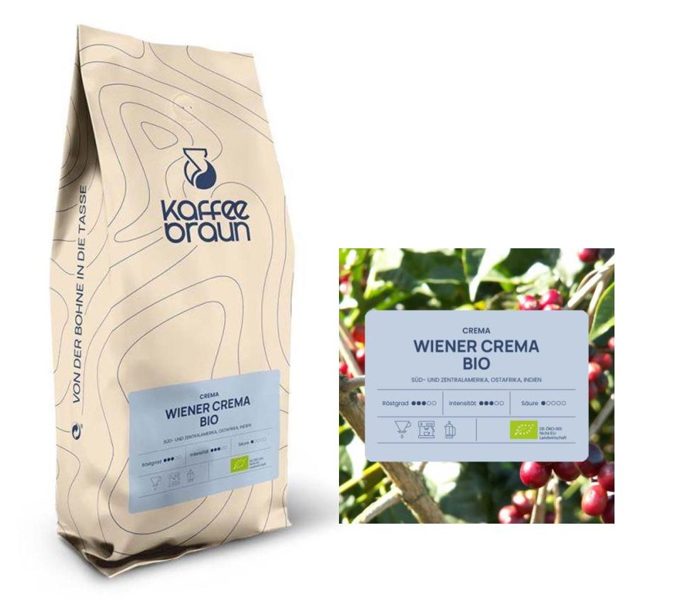 Der Bio Wiener Crema Kaffee ist ein Allrounder und perfekt geeignet für Vollautomaten. Die Kaffeebohnen für diesen biozertifizierten Kaffee stammen aus Süd- und Zentralamerika, Ostafrika und Indien. Er ist eine Komposition aus erlesenen Arabica-Kaffees, kombiniert mit Hochland-Canephora von der Farm Elk Hill in Kerala in Indien. Der Kaffee für den Bio Wiener Crema wird dort unter kontrollierten Bedingungen auf einer Höhe von 800-1.650 Metern angebaut und anschließend handgepflückt, gewaschen und sonnengetrocknet. Er besticht mit einem mildwürzigen Aroma, das nach feiner Schokolade schmeckt und Noten von Karamell und Nuss mit sich bringt. Dieser Kaffee ist sehr vollmundig und rund mit einer dezenten Säure, weshalb er nicht nur Solo sondern auch als Kaffee mit Milch sehr gut geeignet ist.
