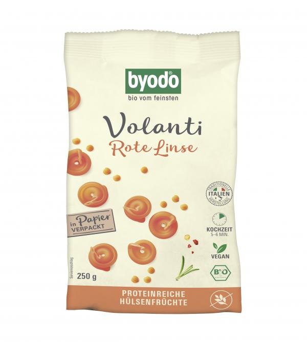 Rund, rot und revolutionär lecker schmecken die Volanti aus roten Bio-Linsen im Byodo Sortiment. Neben wertvollem. pflanzlichen Eiweiß enthalten die feinen, glutenfreien Bio-Nudeln auch jede Menge Ballaststoffe und sättigen auf köstliche Art langanhaltend. Pro Portion rechnet man nur 50 - 60g der leuchtend roten Nudeln.