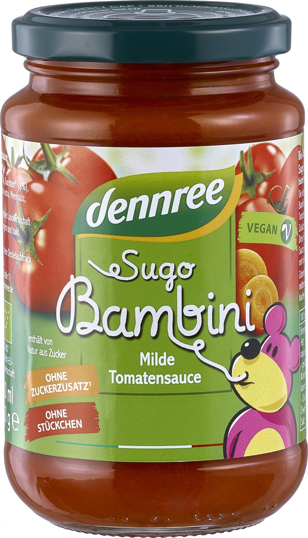 Bio-Tomatensauce Sugo Bambini bietet reinen Genuss. Die dennree Tomatensauce Sugo Bambini wird aus sonnengereiften Tomaten und Gemüse nach traditionellem Rezept hergestellt. Diese fruchtige, mild gewürzte Sauce ist besonders bei Kindern sehr beliebt. Genießen Sie den fruchtig-milden Geschmack.
