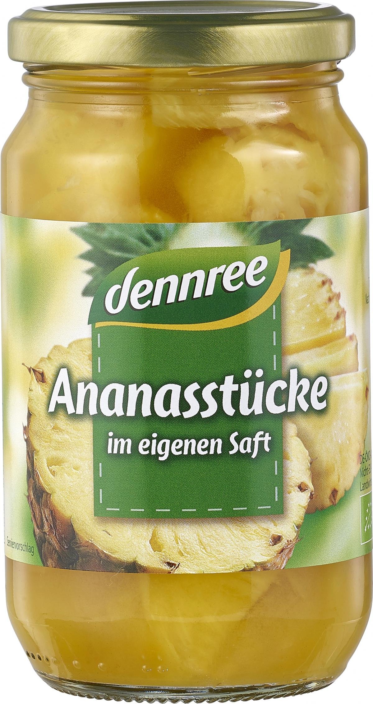 Bio-Ananasstücke bieten reinen Genuss. Für die dennree Ananasstücke werden sonnengereifte Bio-Ananas schonend verarbeitet und im eigenen Saft eingelegt. Sie eignen sich hervorragend als Kuchen- und Tortenbelag sowie für Cocktails und Desserts, sind aber auch pur ein Genuss. Genießen Sie den fruchtig-exotischen Geschmack.