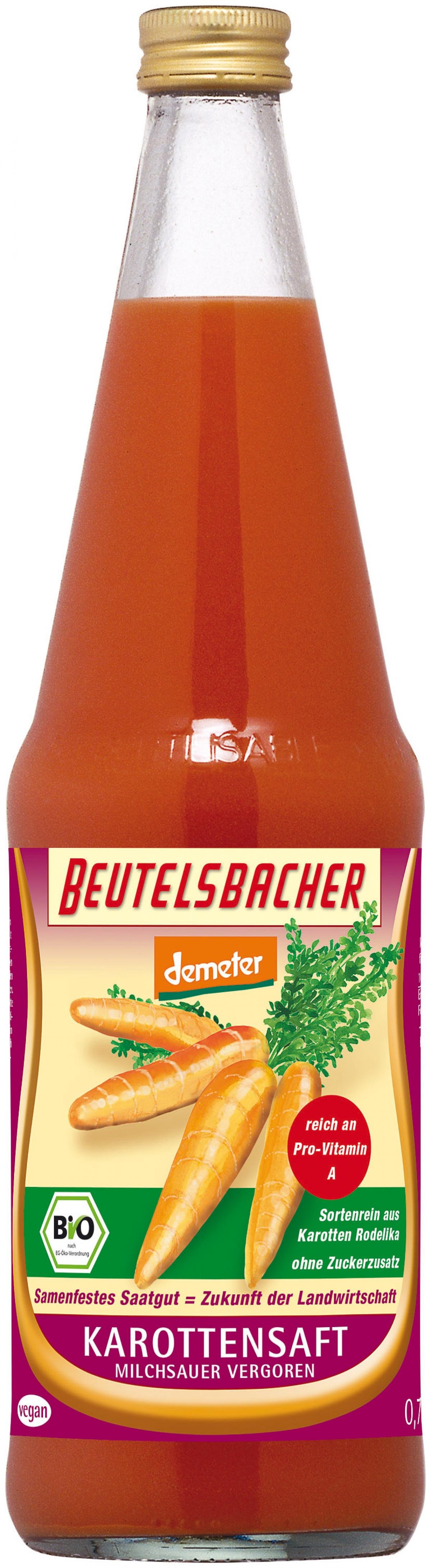 Sortenreiner milchsauer vergorener Direktsaft aus ernte-frischen Karotten ´Rodelika´, die von biologisch-dynamisch gezüchtetem, gentechnikfreiem und samenfestem Saatgut stammen, das heisst nicht von Hybrid-Samen. Hybride entstehen aus der Kreuzung künstlich erzeugter Inzuchtlinien und sind daher umstritten. Mit dem Kauf unterstützen Sie den Anbau und die Saatgut-Züchtung samenfester Karottensorten. Die samenfeste Rodelika ist eine grosse glattschalige Karotte mit intensiv orange-roter Farbe und kräftigem, süssaromatischem Geschmack. Die Karotten werden von Landwirten im sonnenverwöhnten Baden-Württemberg biologisch-dynamisch angebaut. Durch milchsäurebildende Mikroorganismen entsteht eine natürliche Gärung (Lactofermentverfahren). Tipp: Ein halbes Glas (0,1 l) deckt den Tagesbedarf an Vitamin A. Übrigens wird Karottensaft auch wegen des hohen Betacarotin-Gehalts bei der Hautpflege verwendet.