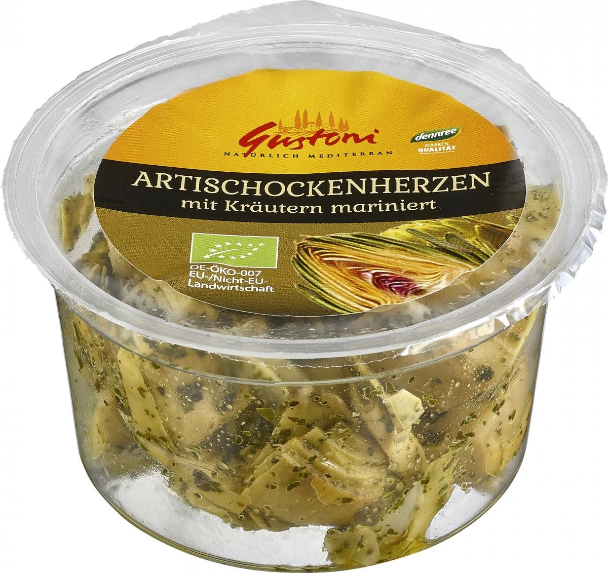 Artischocken* (90%), Sonnenblumenöl*, Kräuter* (3%) (Basilikum*, Petersilie*, Oregano*, Thymian*, Rosmarin*), Meersalz, Olivenöl* nativ extra, Zitronensaftkonzentrat*, Branntweinessig*
