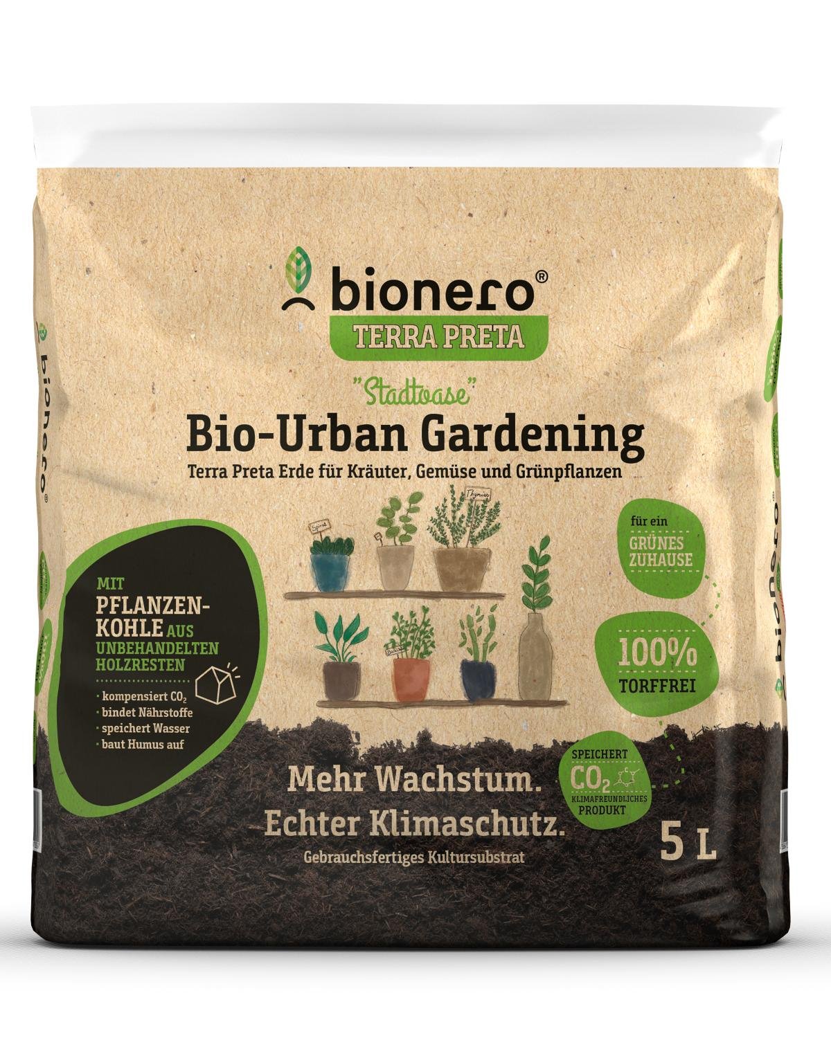 Die bionero Terra Preta Bio-Urban Gardening ´Stadtoase´ ist ein gebrauchsfertiges Kultursubstrat und kann ohne vorheriges Vermischen für Pflanzen aller Art, drinnen und draußen verwendet werden. Die Erde entsteht in einem langen Reifeprozess. Die beigesetzte, aktivierte Pflanzenkohle dient im Boden als optimaler Nährstoff- und Wasserspeicher und bietet wichtigen Lebensraum für essenzielle Mikroorganismen. Es wird bewusst auf Torf, Mineraldünger und andere CO2-intensive Rohstoffe verzichtet. Terra Preta ist eine im Amazonasgebiet wiederentdeckte Schwarzerde, die über außergewöhnliche Speicherkapazitäten verfügt und dadurch besonders fruchtbar ist. bionero hat das Herstellungsverfahren dieser fruchtbaren Schwarzerde modernisiert und optimiert und stellt so fruchtbare Schwarzerden made in Germany her. Regionale Produktion, kurze Transportwege, nachhaltige Wertschöpfungsketten, echter Klimaschutz: Bei der Auswahl aller Rohstoffe wird genau hingesehen und sich nur für wirklich nachhaltige Produkte entschieden. Durch das einzigartige Produktionsverfahren gelingt es bionero, mehr CO2 aus der Atmosphäre zu entziehen, als emittiert wird. Mehr dazu unter www.bionero.de