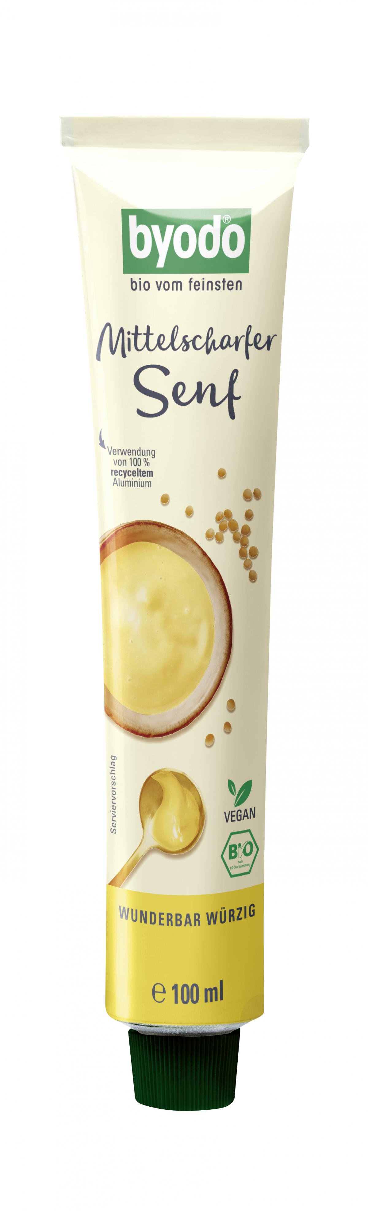 Der mittelscharfe Bio-Senf von Byodo schmeckt nicht nur zu Wurst und Käse, sondern verfeinert Dressings, Suppen sowie Fisch- und Fleischgerichte. Dank der praktischen Tube lässt er sich einfach portionieren.