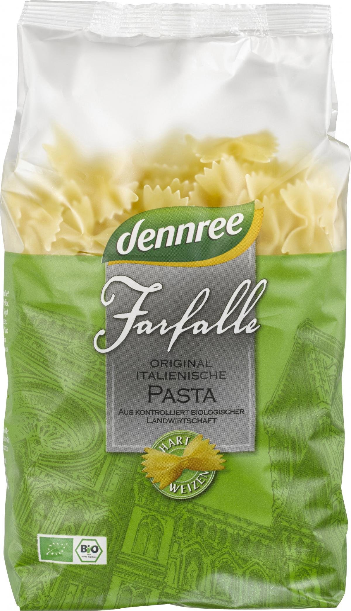 Bio-Hartweizen-Farfalle bieten reinen Genuss. Für die dennree Hartweizen-Farfalle wird nur ausgewählter Hartweizen aus kontrolliert biologischer Landwirtschaft verwendet und nach original italienischem Rezept schonend verarbeitet. Genießen Sie den exzellenten Geschmack und den idealen "al dente" Biss der dennree Pasta.
